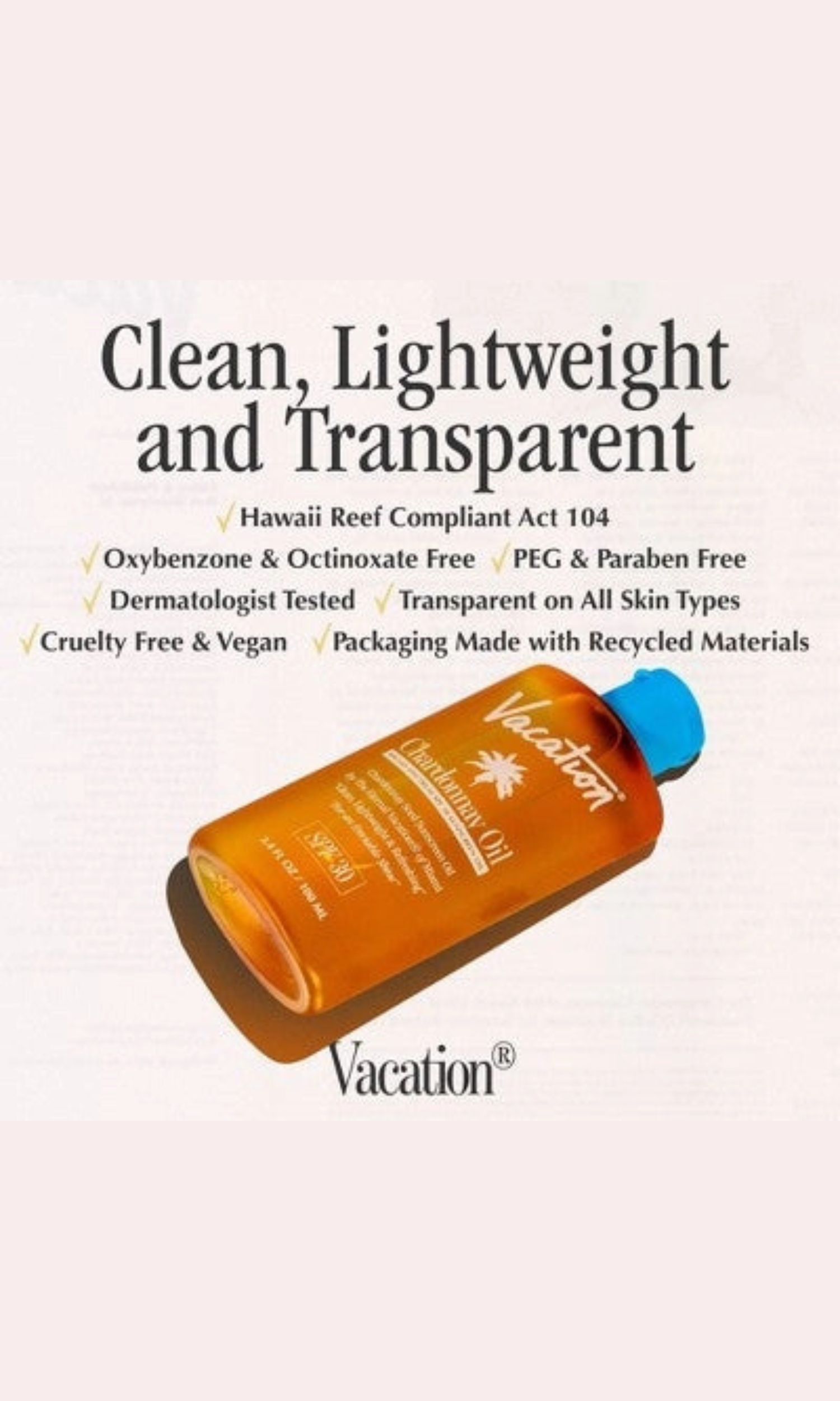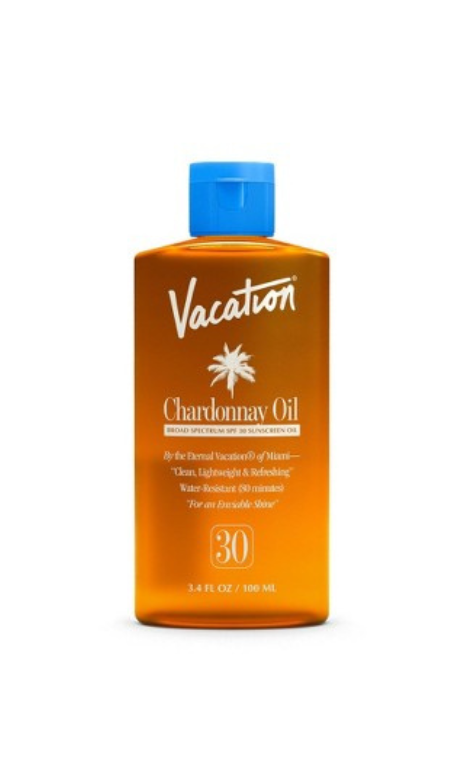 Vacation Chardonnay Oil SPF 30 is a lightweight SPF 30 sunscreen oil made from Chardonnay grapeseed oil that delivers an enviable, subtle shine while hydrating and protecting your skin.