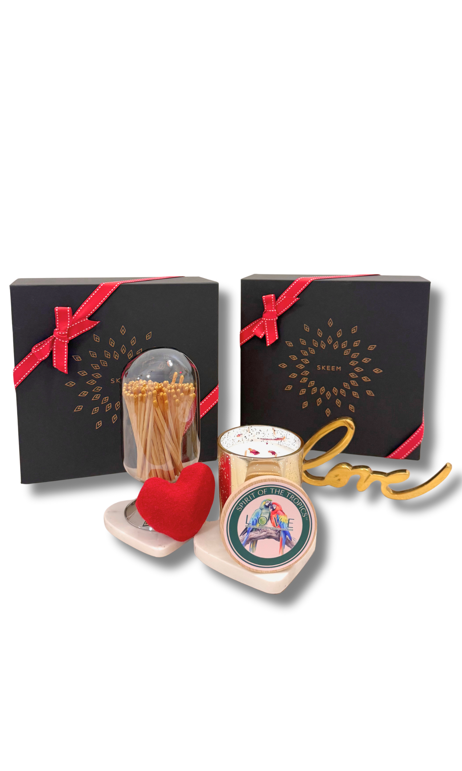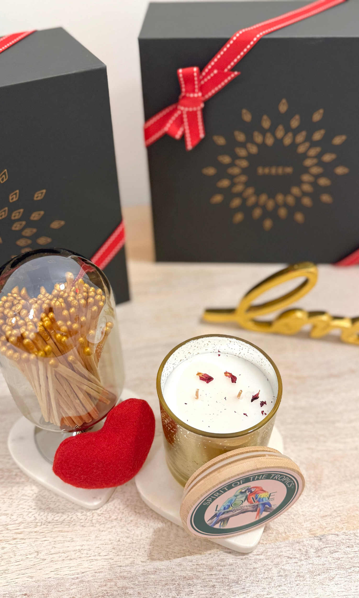 Treat someone special with our Valentine's Day Gift Box Set. This special gift includes gold-tipped matches with a Love Organic Mercury Glass Jar Candle with exotic blends of grapefruit, vanilla, patchouli and rosewater this candle brings positive intention to your space. Burn the candle and watch the magic happen when the light flickers through the mercury glass!
