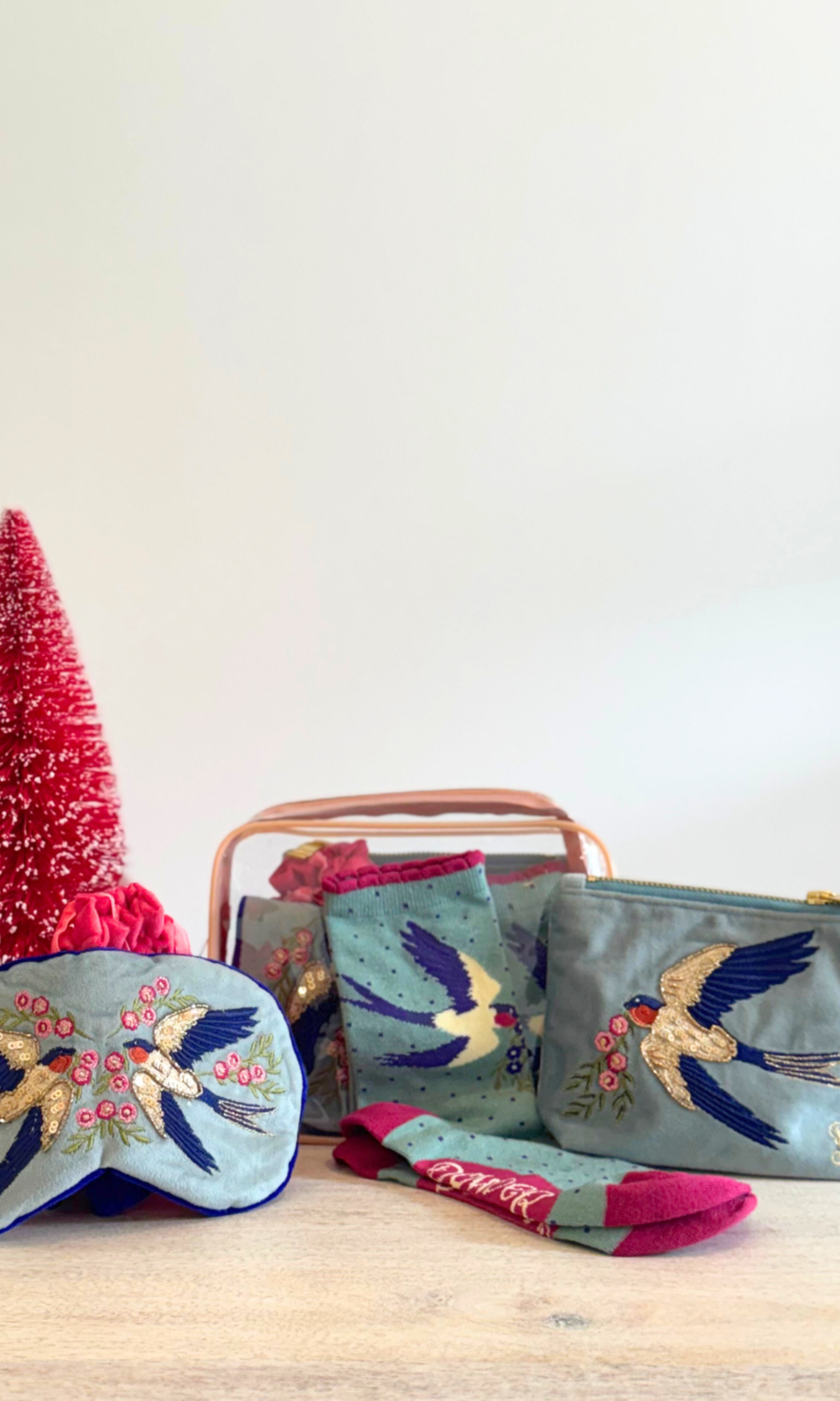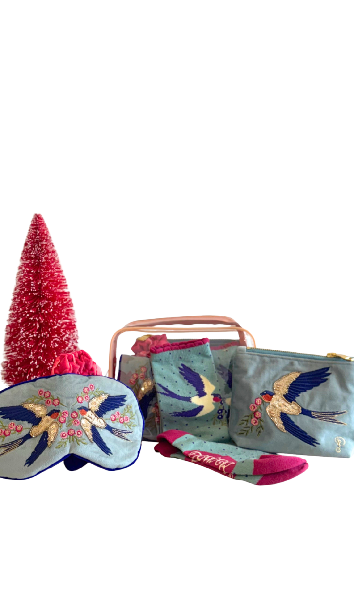 This set is the perfect gift! The Voyage Kit Songbirds Set includes an sleep mask, a pair of socks, and a small pouch perfect for filling with essentials. The embroidered songbird adds the perfect touch of serenity and femininity to the set.