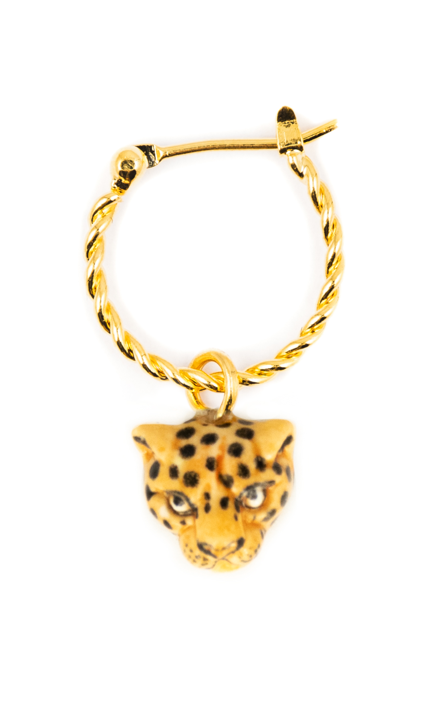 These small hoop earrings with a porcelain leopard dangling on the bottom are made and painted by hand which makes it dainty and unique. Treat yourself to something new to make your outfit pop!