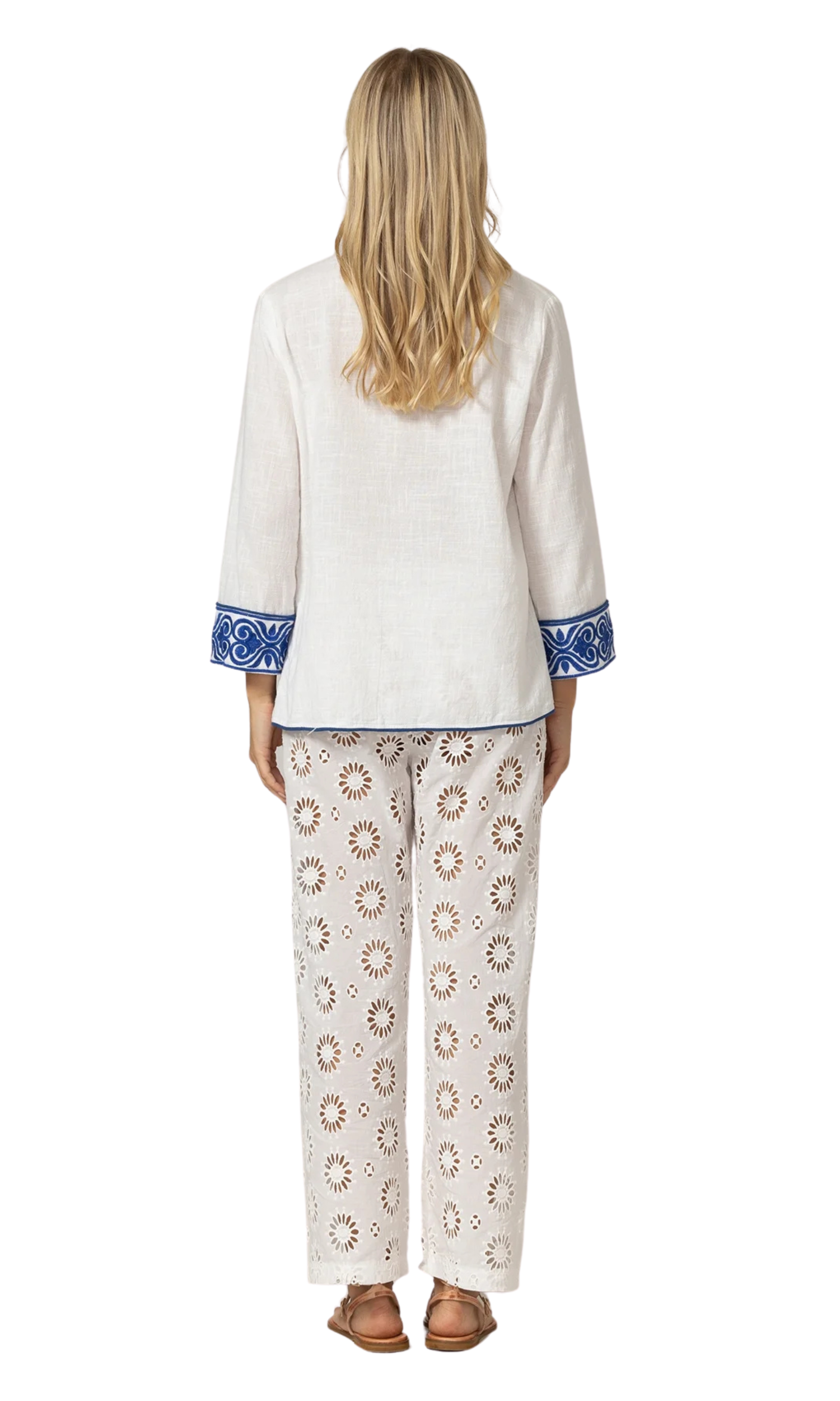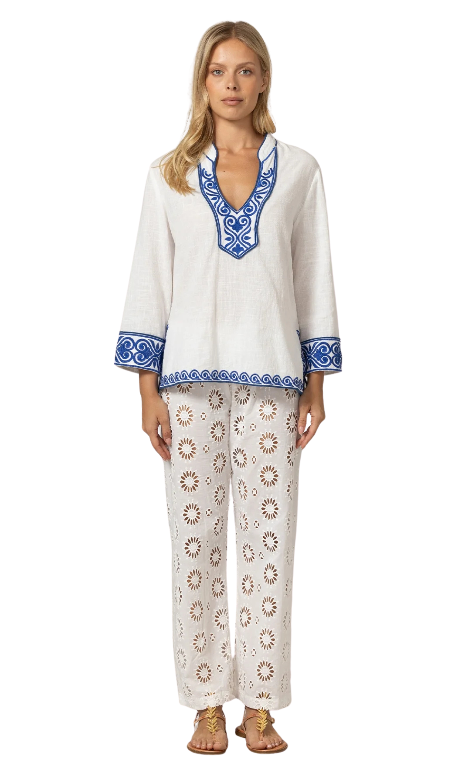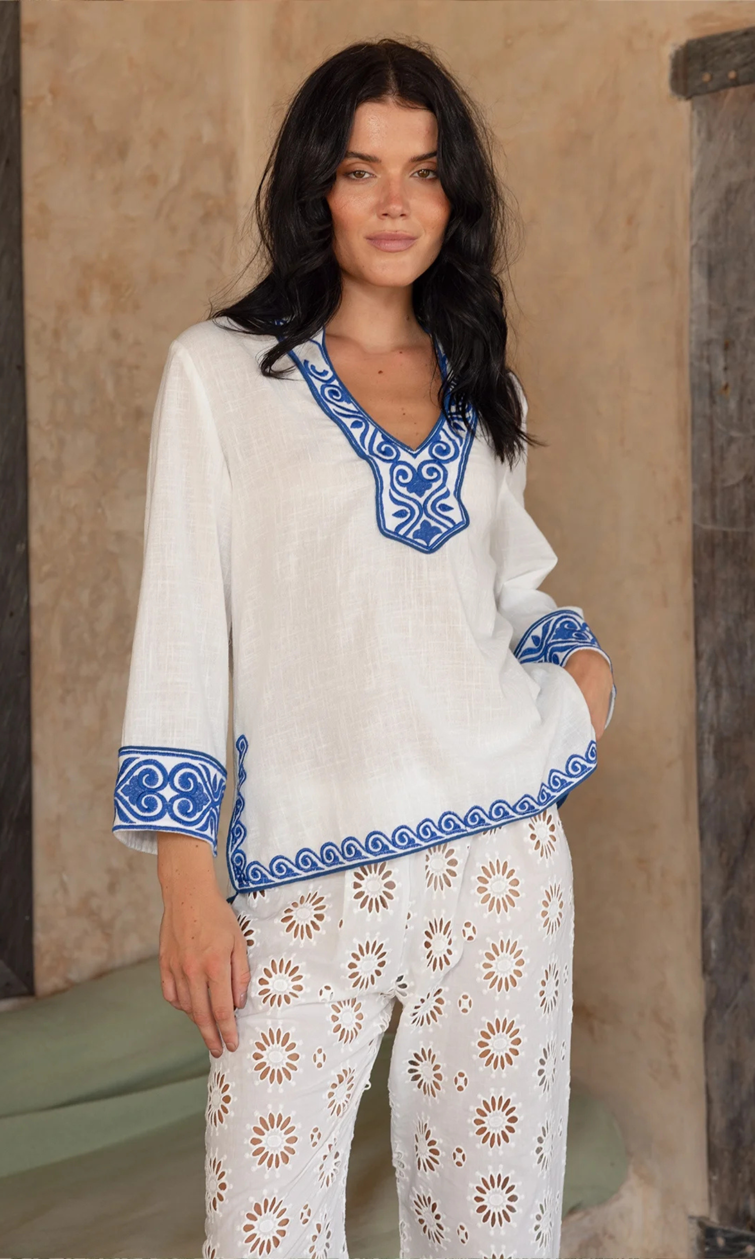Embark on a journey into the world of boho chic with the Meira Blouse, a unique piece designed to enhance the beauty of elegant and daring women. With its subtle blue patterns, delicate long sleeves, and refined V-neckline, this blouse strikes the perfect balance between sophistication and a free-spirited charm. Crafted from 100% cotton, it showcases exceptional artisanal craftsmanship, boasting precise details and premium textures.