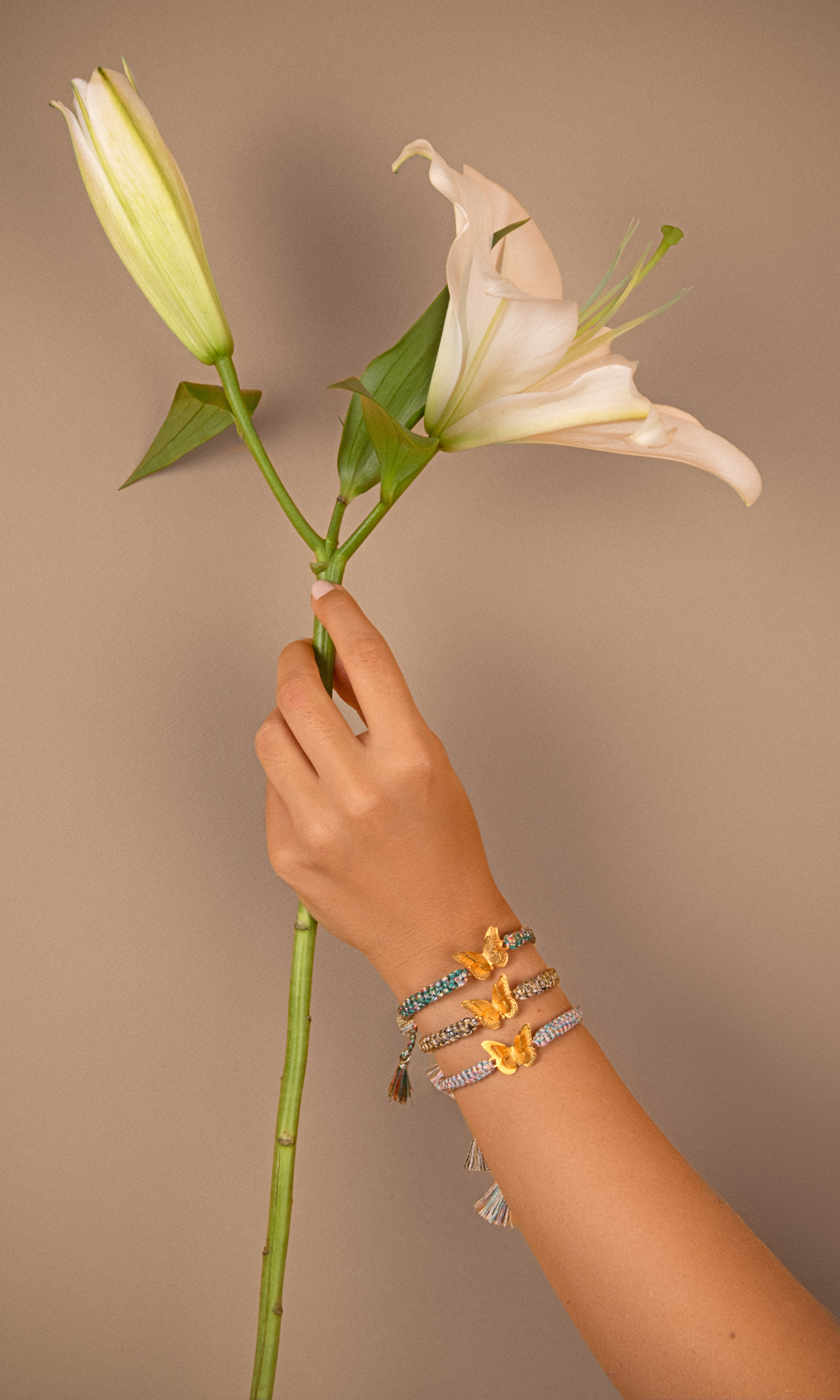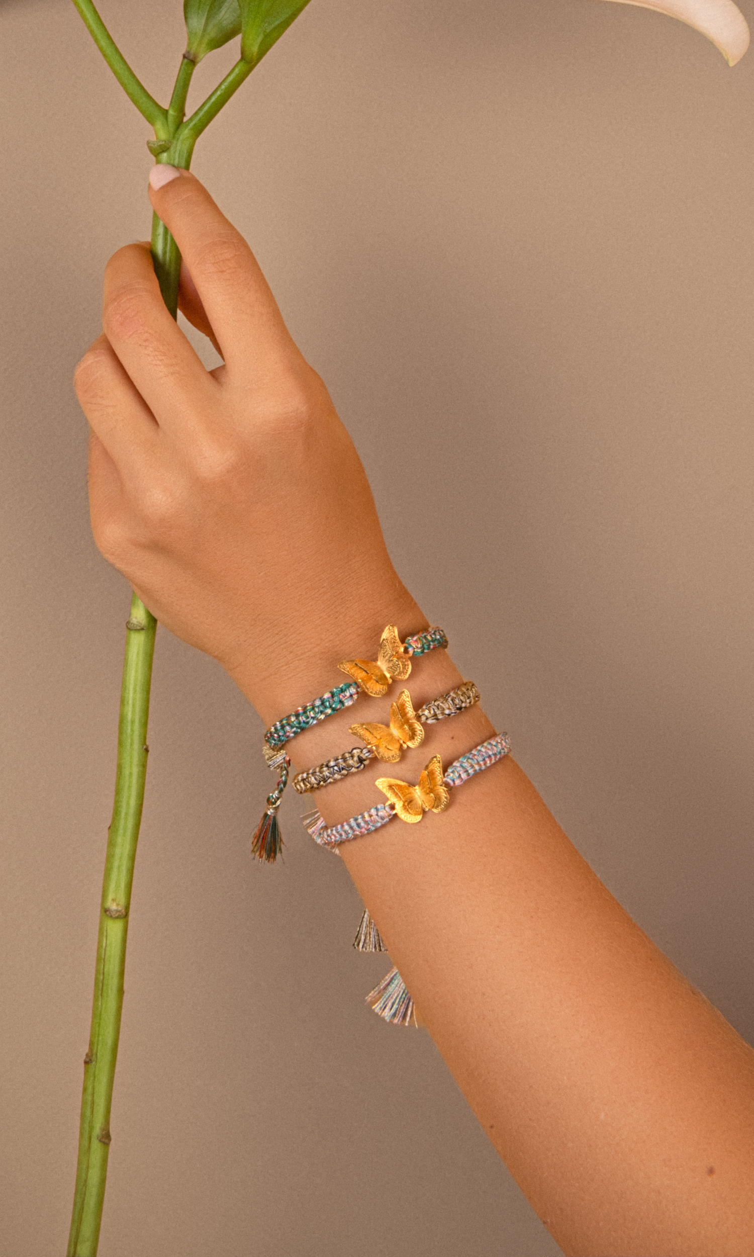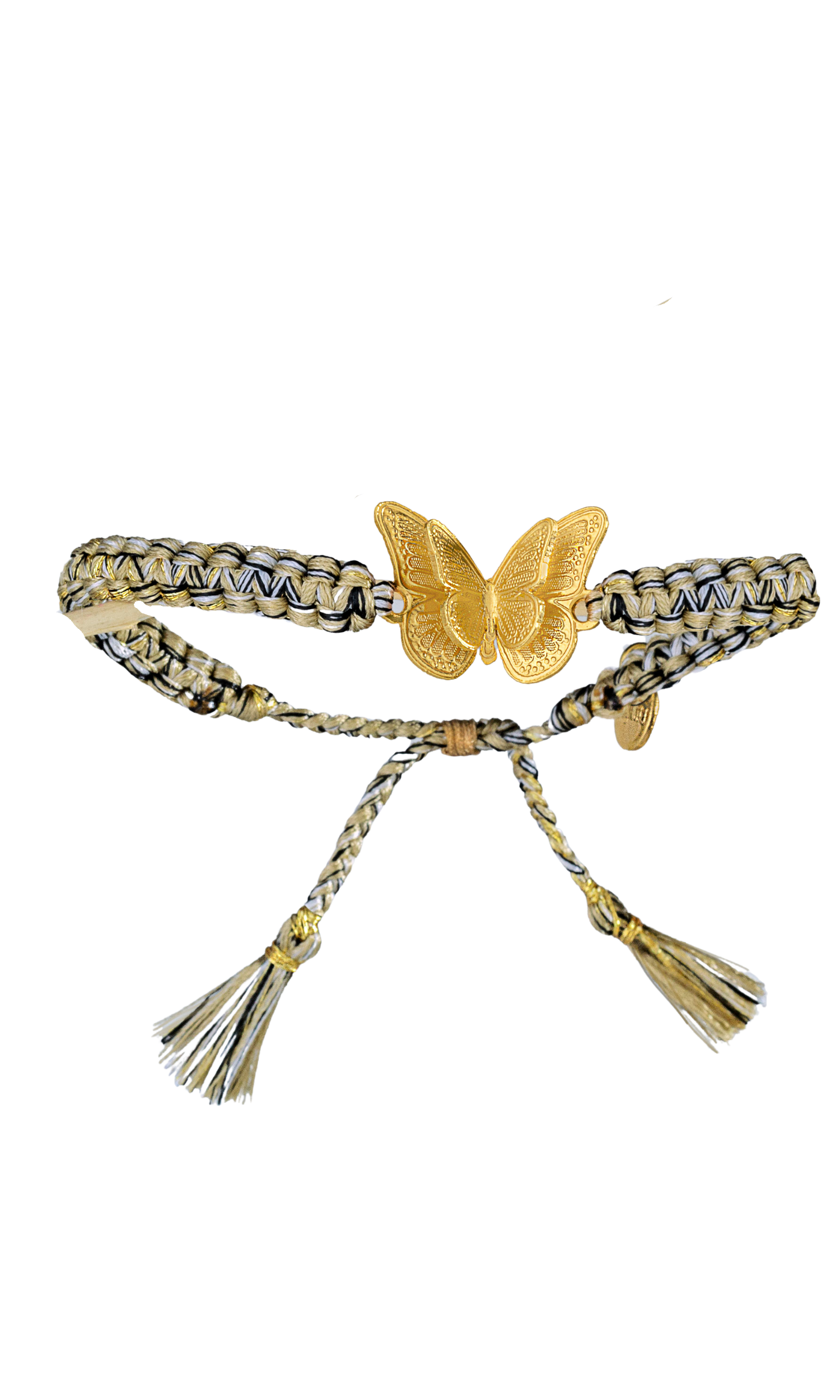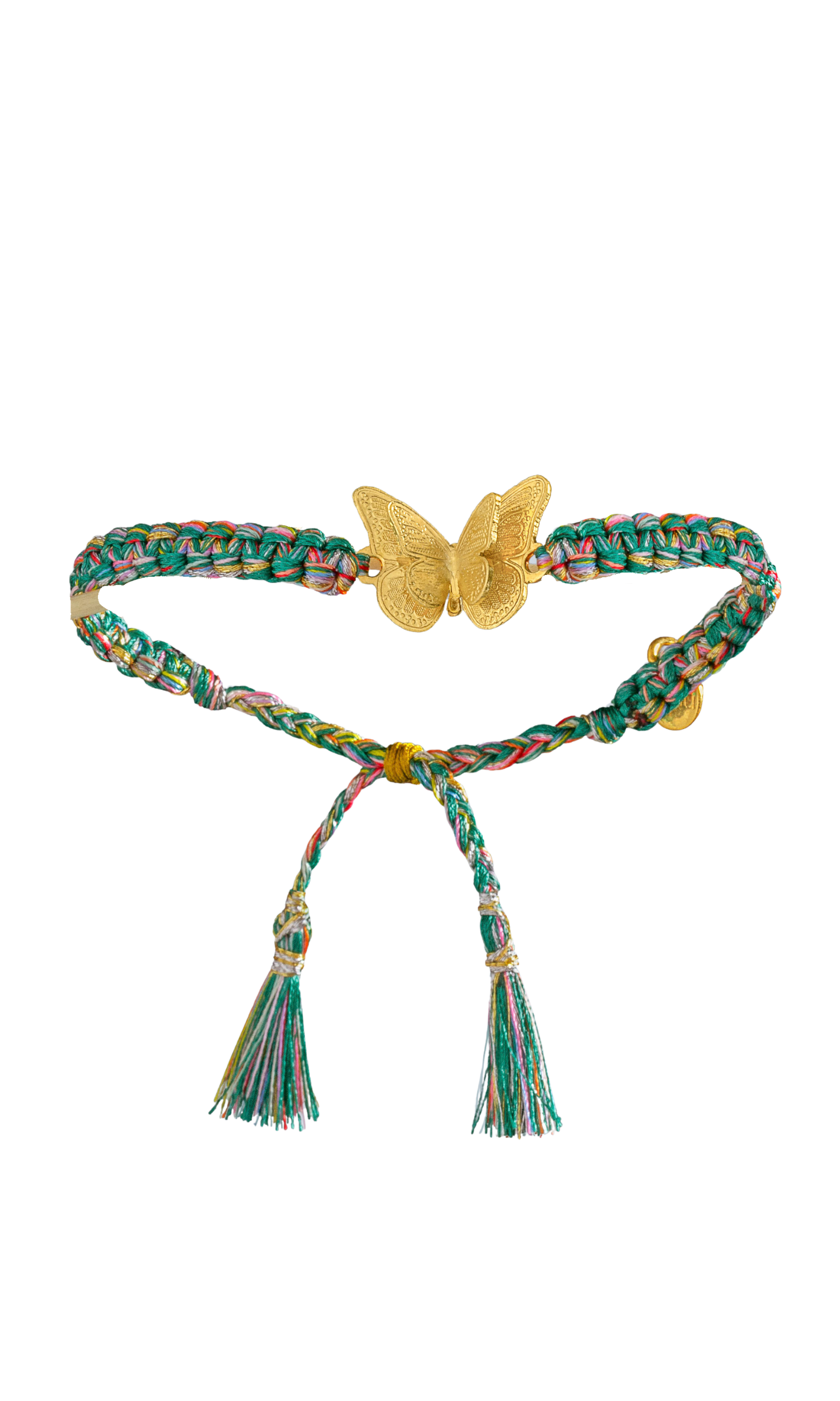 This braided bracelet features a beautiful gold butterfly and colorful thread. It's a fun way to accessorize your look! Delicately handmade in Colombia, this is perfect if you want to gift someone a special and unique gift.