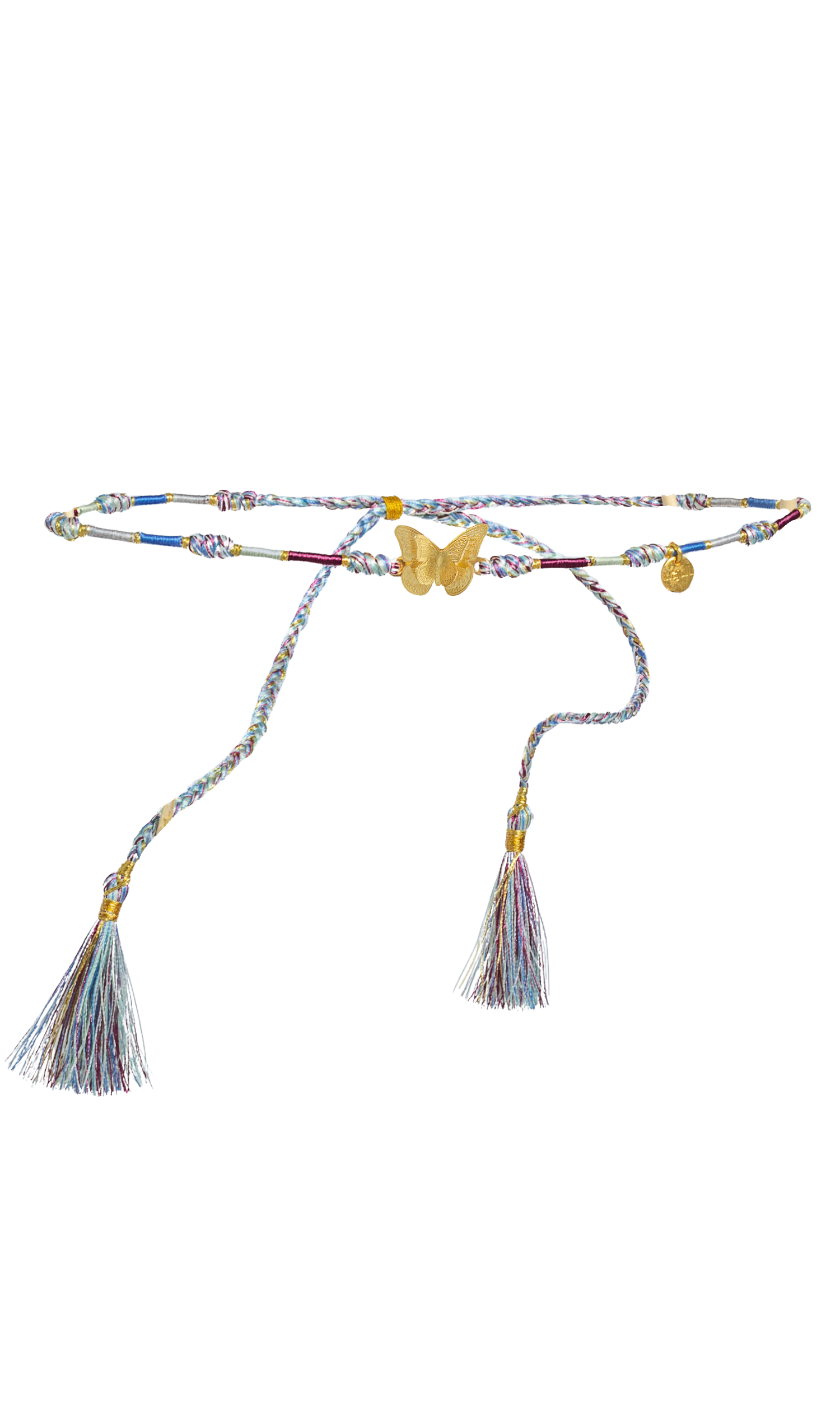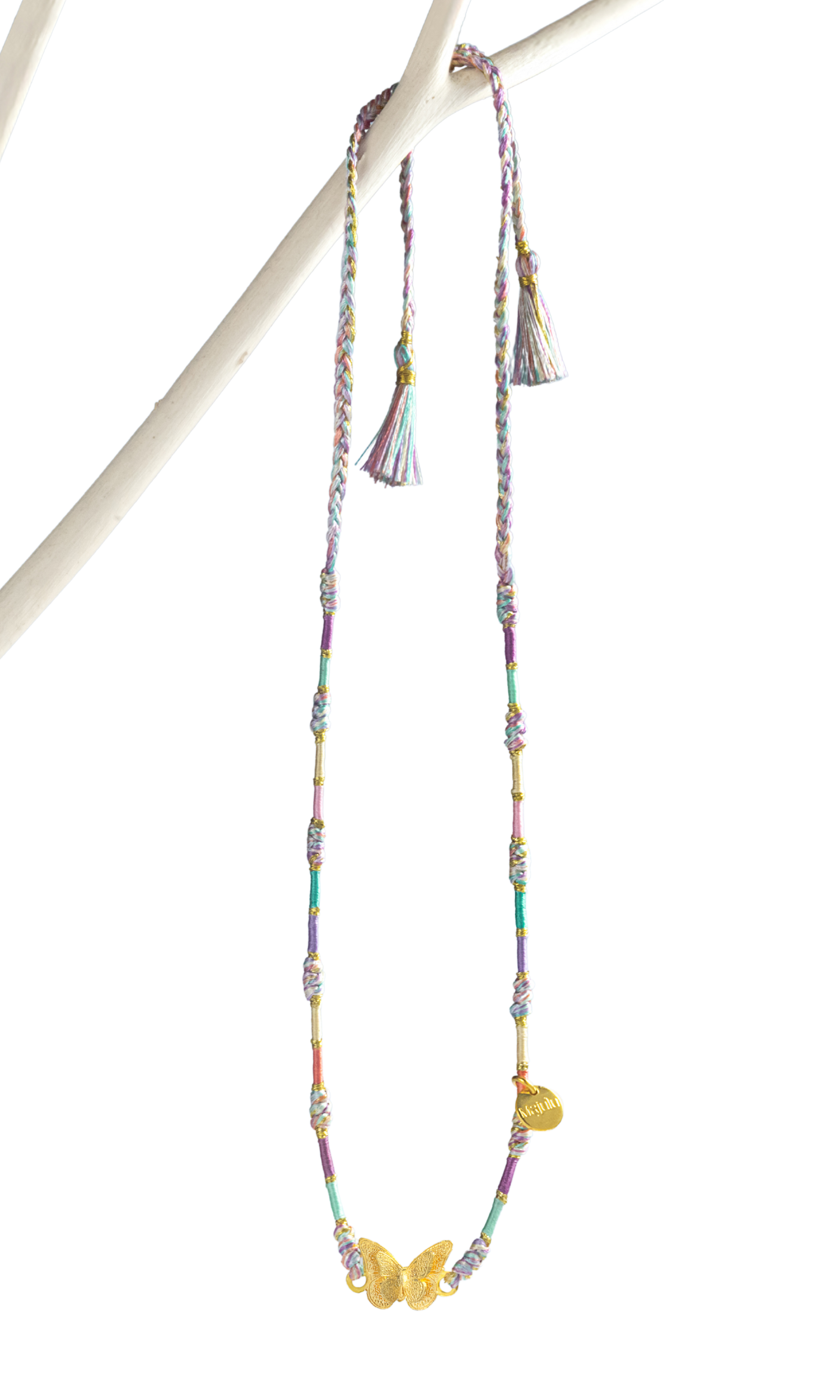 This woven necklace features beautiful colored threads with the 3D butterfly charm in the middle that creates a unique depth. It's a fun way to accessorize your look with a more bohemian feel! You can adjust the ties and make it loose or wear it a choker. Delicately handmade in Colombia, this is perfect if you want to gift someone a special and unique gift.
