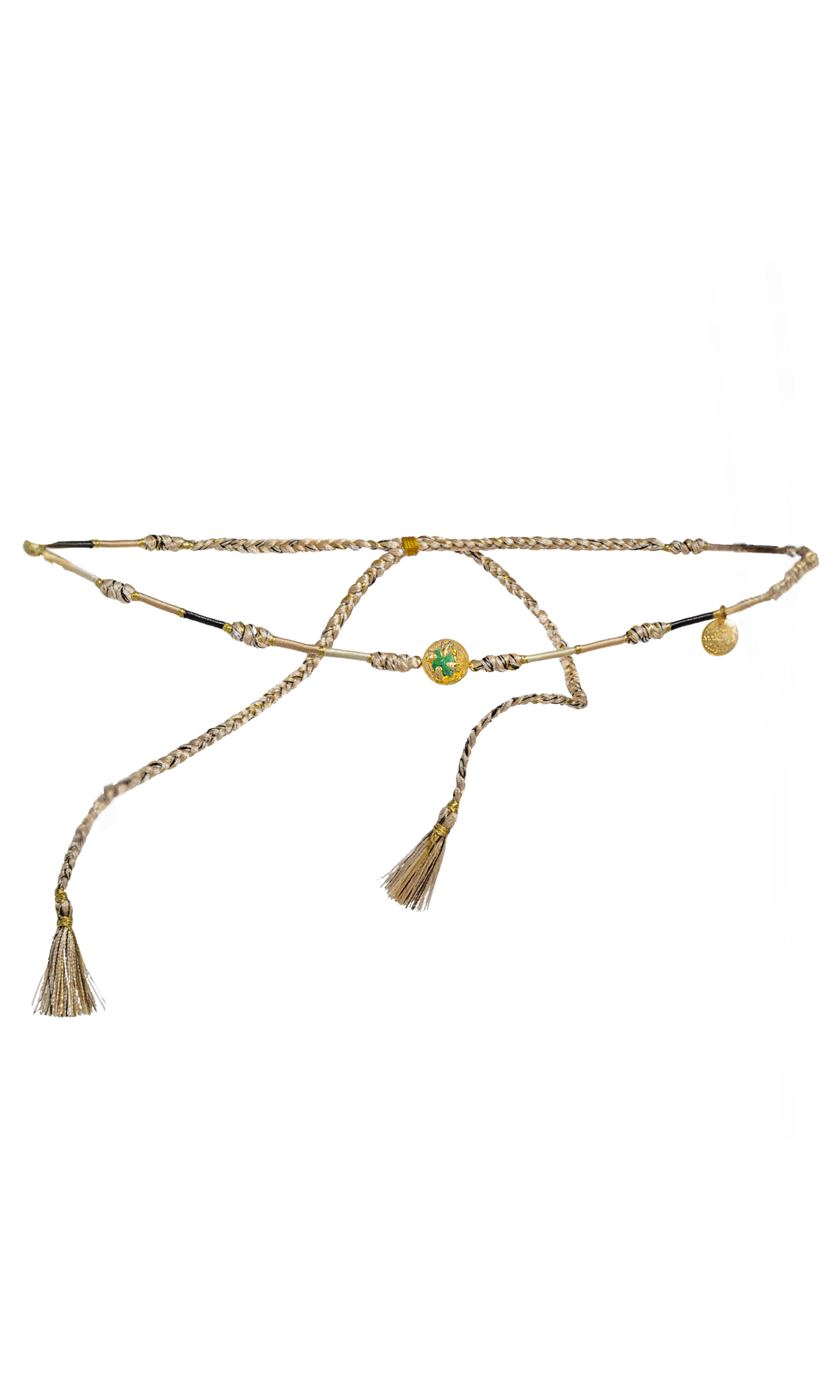 This braided necklace features beautiful beige threads, an emerald, and a gold pendant for a unique design. It's a fun way to accessorize your look with a more bohemian feel! You can adjust the ties and make it loose or wear it a choker. Delicately handmade in Colombia, this is perfect if you want to gift someone a special and unique gift.