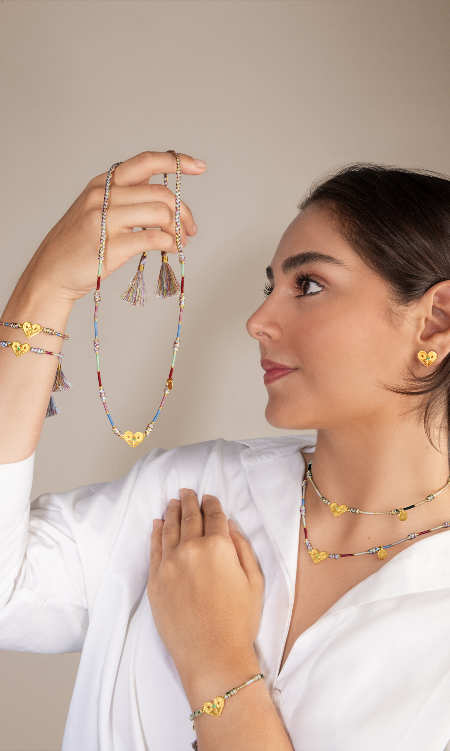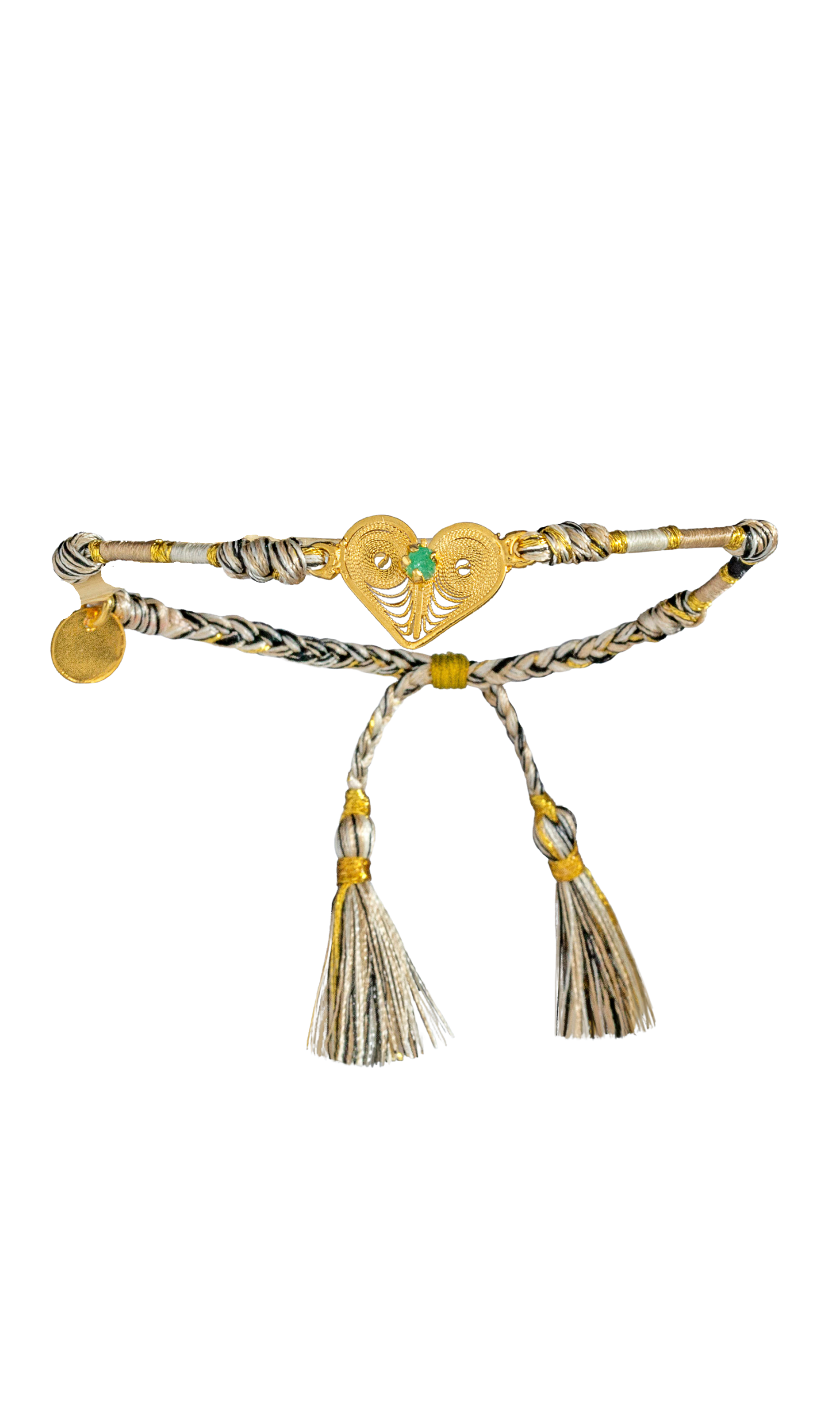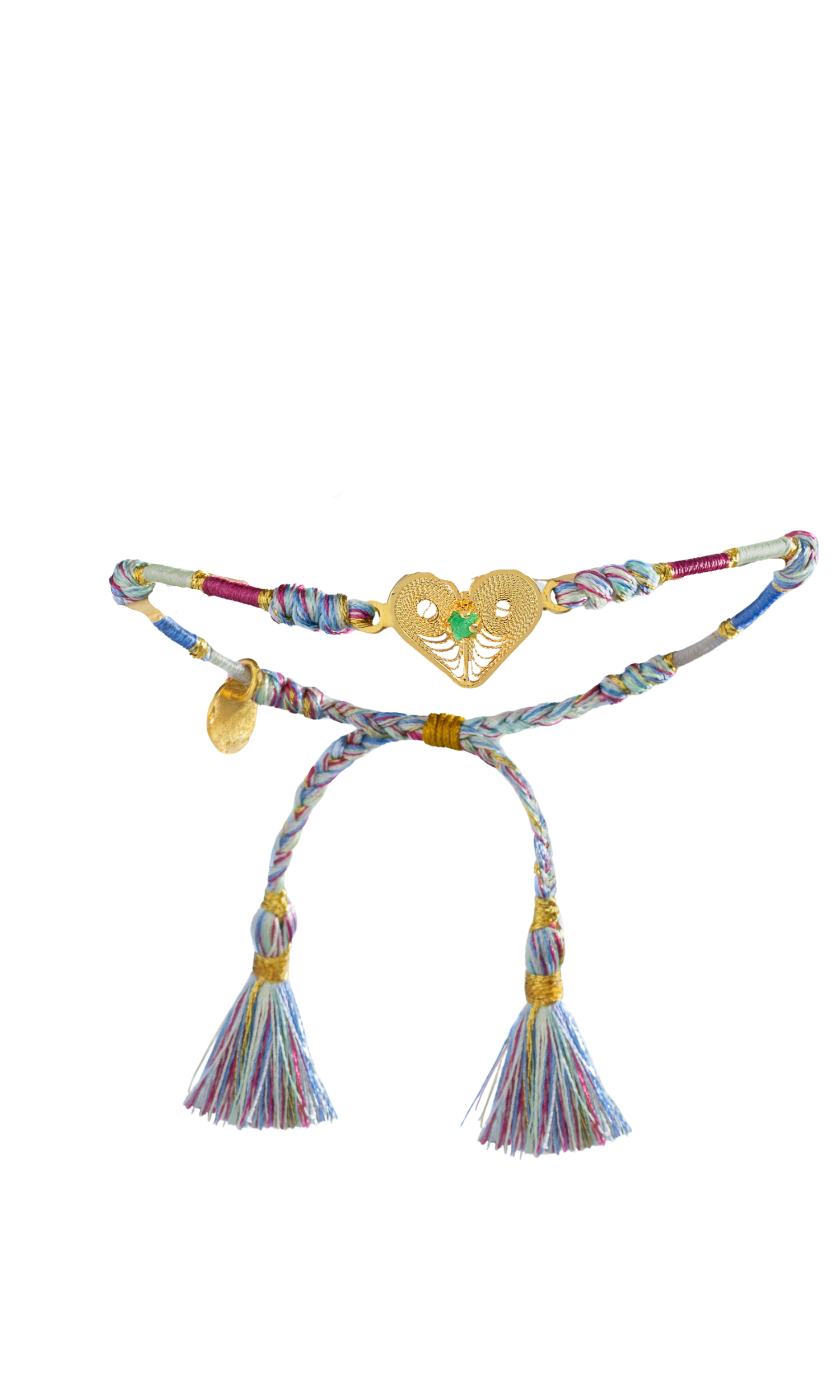 This woven bracelet features beautiful colored threads with a heart charm in the middle. The charm includes a green stone that sparkles in the middle. It's a fun way to accessorize your look! Delicately handmade in Colombia, this is perfect if you want to gift someone a special and unique gift.